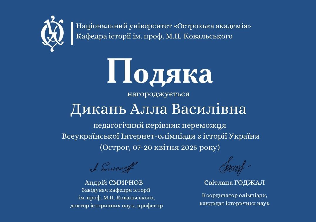 Особливу подяку адміністрація ліцею висловлює вчителю історії, Дикань Аллі Василівні, за її професіоналізм, натхнення та кропітку працю у підготовці учнів до олімпіади. Її відданість справі та вміння зацікавити учнів історією України є запорукою їхніх успіхів.