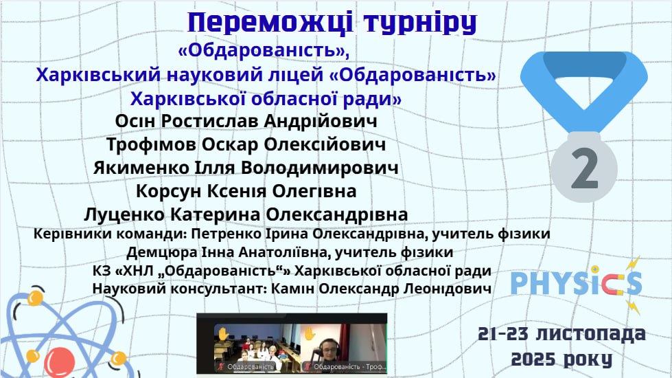 З 21 по 23 листопада 2025 року відбувся ХХХІV міський турнір юних фізиків для учнів 9–11-х класів закладів освіти м. Харкова.
